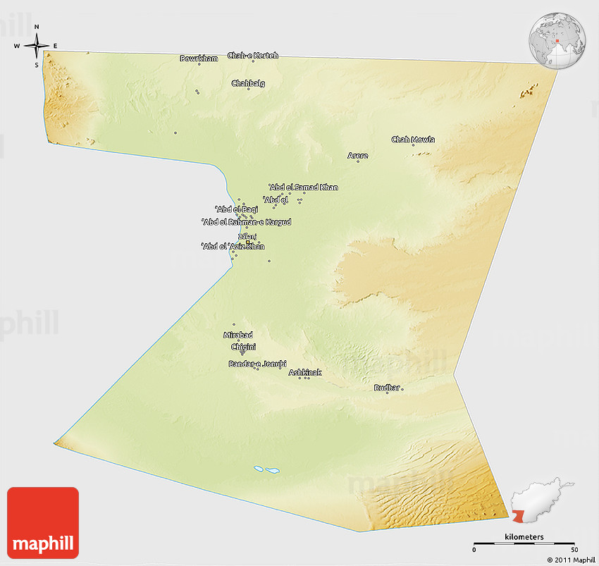 Physical map illustrates the mountains, lowlands, oceans, lakes and rivers and other physical landscape features of Nimruz. Differences in land elevations relative to the sea level are represented by color.