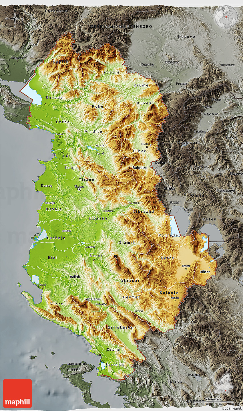 Physical map illustrates the mountains, lowlands, oceans, lakes and rivers and other physical landscape features of Albania. Differences in land elevations relative to the sea level are represented by color.