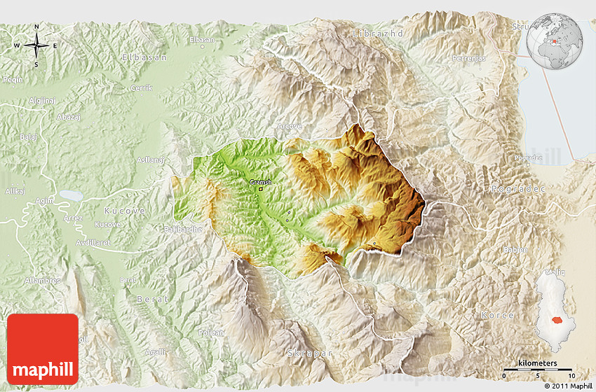 Physical map illustrates the mountains, lowlands, oceans, lakes and rivers and other physical landscape features of Gramsh. Differences in land elevations relative to the sea level are represented by color.