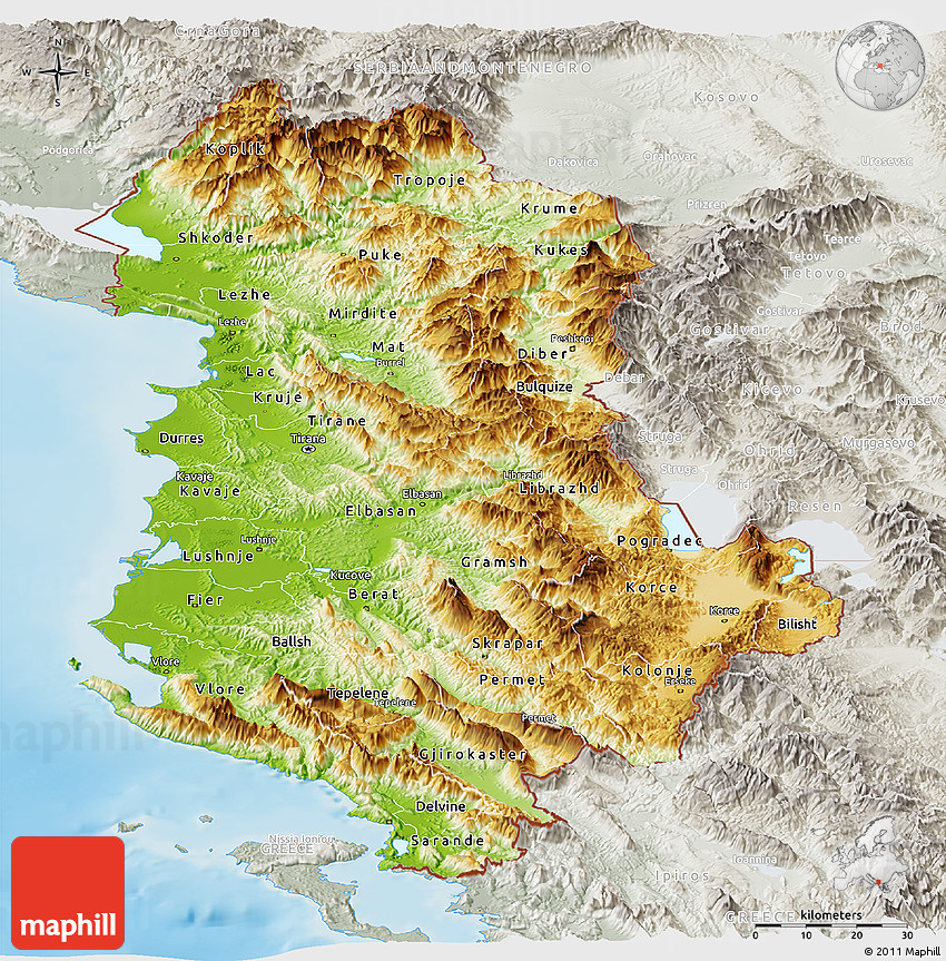 Physical map illustrates the mountains, lowlands, oceans, lakes and rivers and other physical landscape features of Albania. Differences in land elevations relative to the sea level are represented by color.