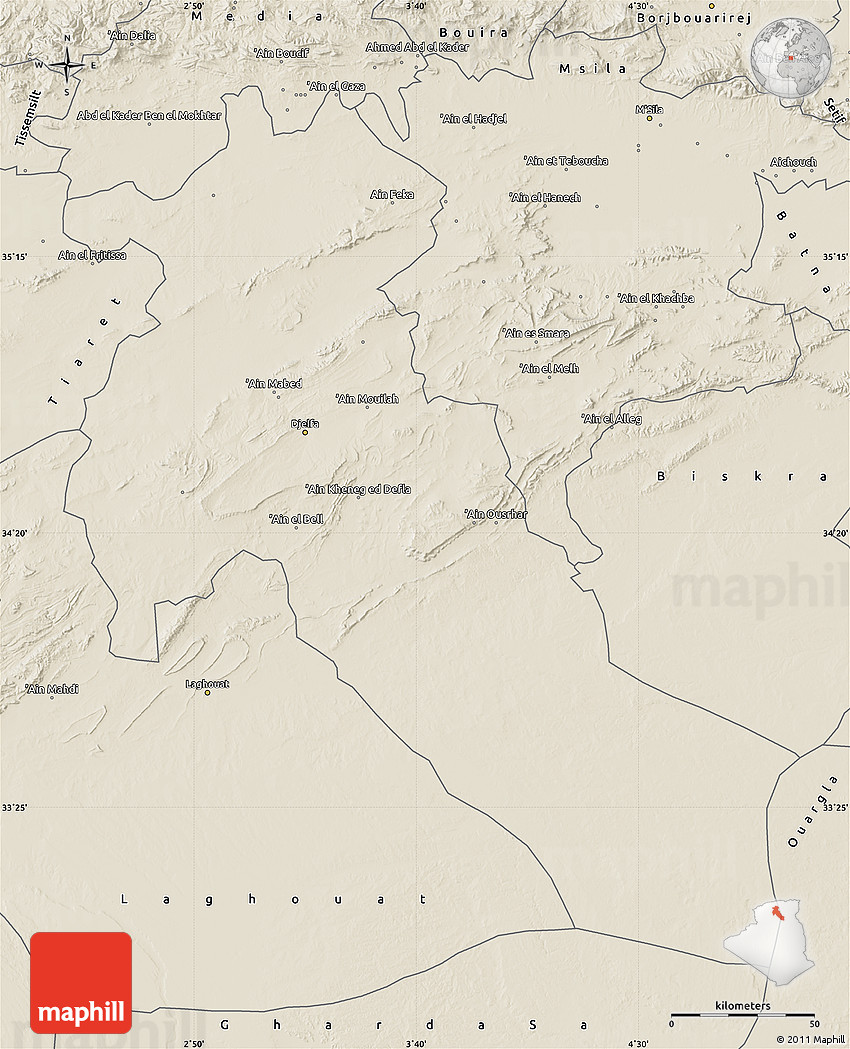 Maphill is a collection of map images. This shaded relief map of Djelfa is one of them. Click on the Detailed button under the image to switch to a more detailed map.