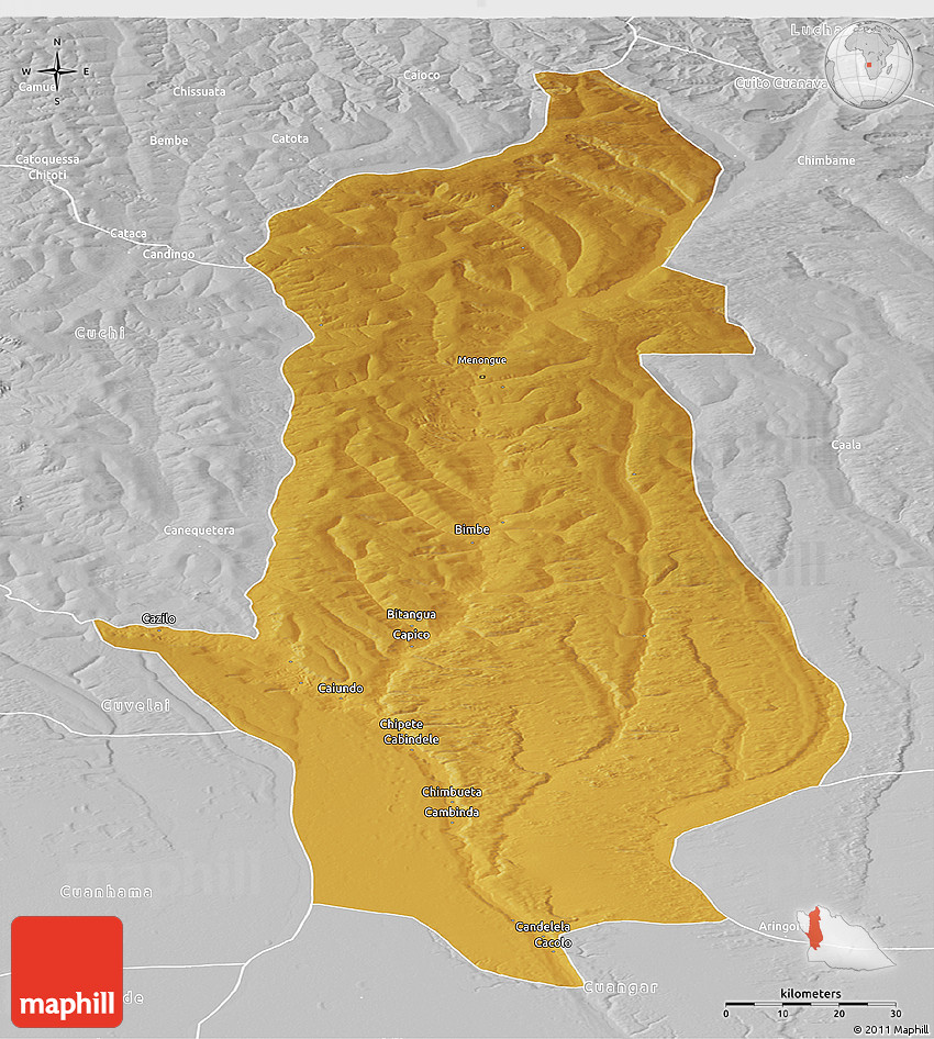 The panoramic physical map represents one of several map types and styles available. Look at Menongue, Cuando Cubango, Angola from different perspectives.