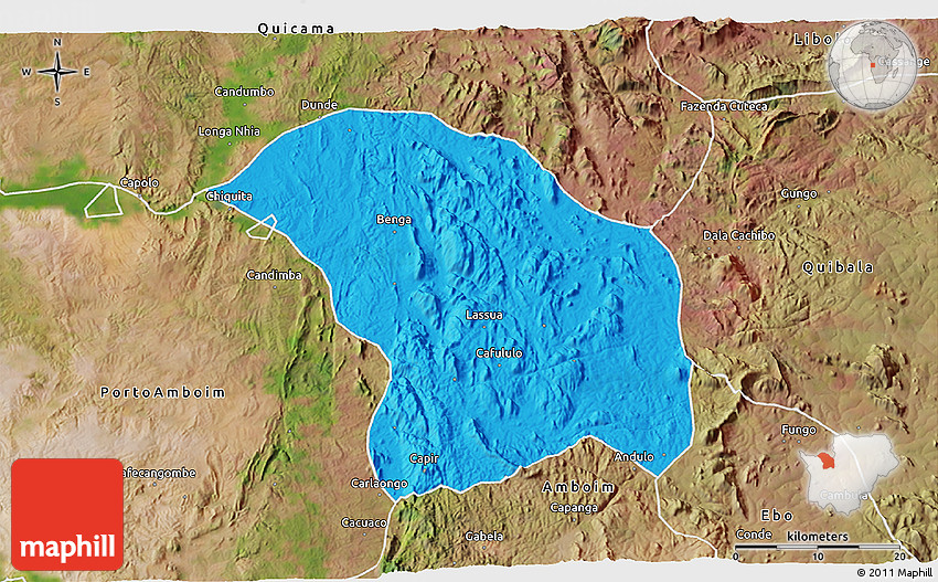 The 3D political map represents one of several map types and styles available. Look at Quilenda, Cuanza Sul, Angola from different perspectives.