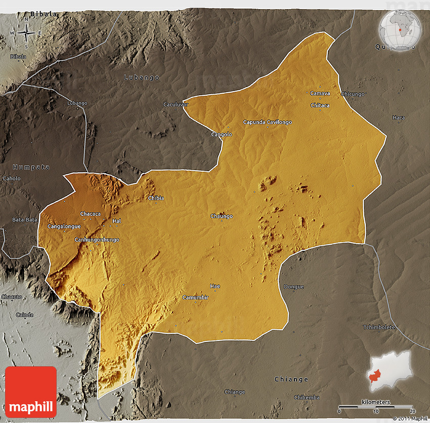 The 3D physical map represents one of several map types and styles available. Look at Chibia, Huila, Angola from different perspectives.