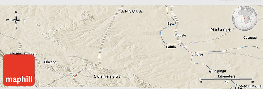 The panoramic shaded relief map represents one of many map types and styles available. Look at Cuteque, Cangandala, Malanje, Angola from different perspectives.