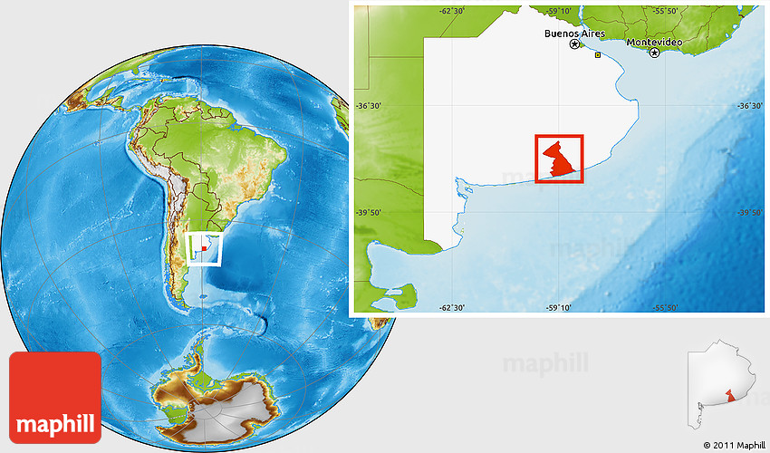 Maphill is a collection of map images. This image combines a physical map with the globe centered on Necochea. Use the buttons under the image to switch to different map types.