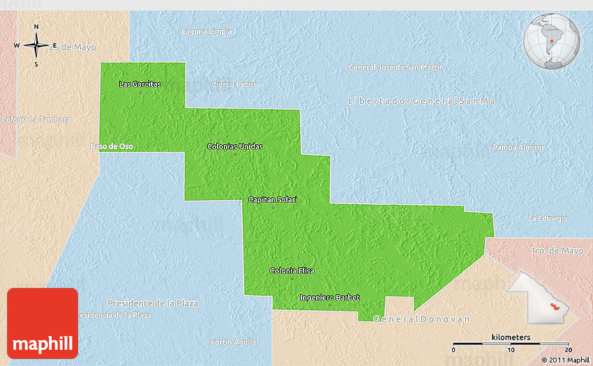 The 3D political map represents one of several map types and styles available. Look at Sargento Cabral, Chaco, Argentina from different perspectives.