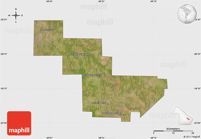 The flat satellite map represents one of several map types and styles available. Look at Sargento Cabral, Chaco, Argentina from different perspectives.