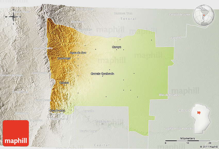 The 3D physical map represents one of several map types and styles available. Look at Colon, Cordoba, Argentina from different perspectives.