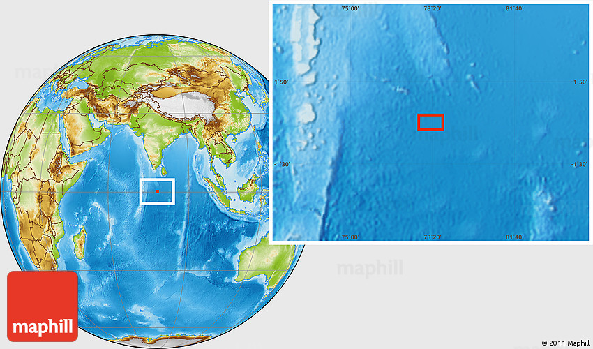 Maphill is a collection of map images. This image combines a physical map with the globe centered on the area around 0° 10' 31" N, 78° 16' 30" E. Use the buttons under the image to switch to different map types.