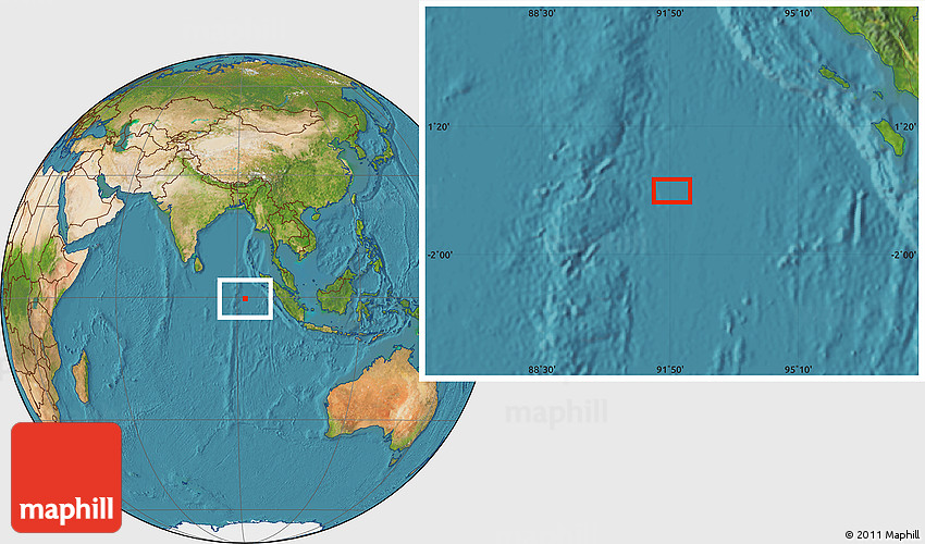 Maphill is a collection of map images. This image combines a satellite map with the globe centered on the area around 0° 21' 0" S, 91° 52' 30" E. Use the buttons under the image to switch to different map types.
