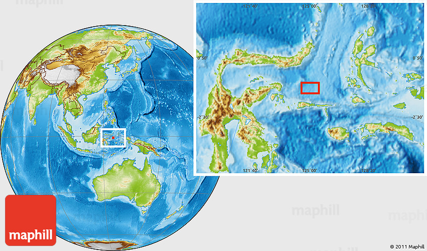 Maphill is a collection of map images. This image combines a physical map with the globe centered on the area around 0° 52' 31" S, 125° 1' 30" E. Use the buttons under the image to switch to different map types.