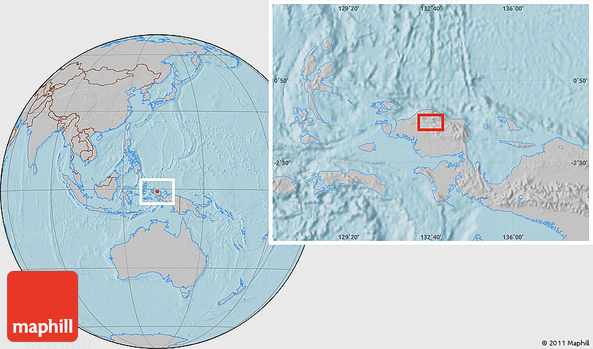 Maphill is a collection of map images. This image combines a gray map with the globe centered on the area around 0° 52' 31" S, 132° 40' 30" E. Use the buttons under the image to switch to different map types.