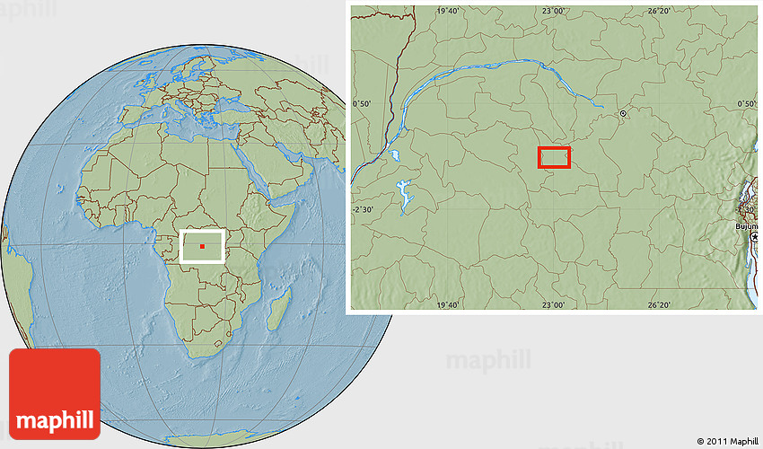 Maphill is a collection of map images. This image combines a savanna style map with the globe centered on the area around 0° 52' 31" S, 23° 1' 29" E. Use the buttons under the image to switch to different map types.