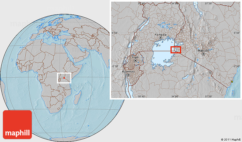 Maphill is a collection of map images. This image combines a gray map with the globe centered on the area around 0° 52' 31" S, 34° 4' 30" E. Use the buttons under the image to switch to different map types.