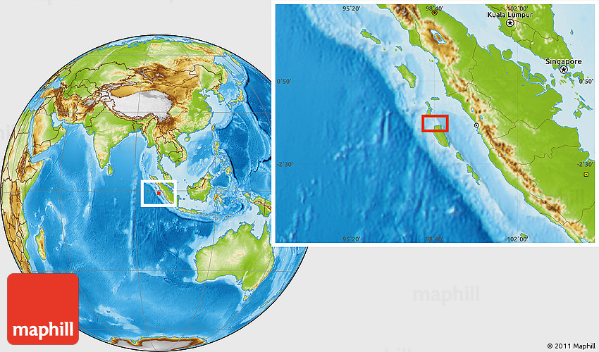 Maphill is a collection of map images. This image combines a physical map with the globe centered on the area around 0° 52' 31" S, 98° 40' 30" E. Use the buttons under the image to switch to different map types.