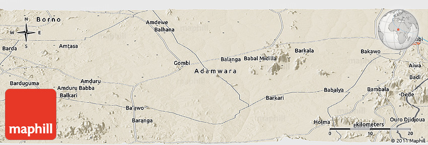 Shaded relief map shows landscape features, such as mountains, valleys and plateaus. Flat areas are smooth on the map, areas with steep slopes and mountains appear more rough. The above map of the area around 10° 7' 21" N, 12° 49' 29" E was created using a digital elevation model.