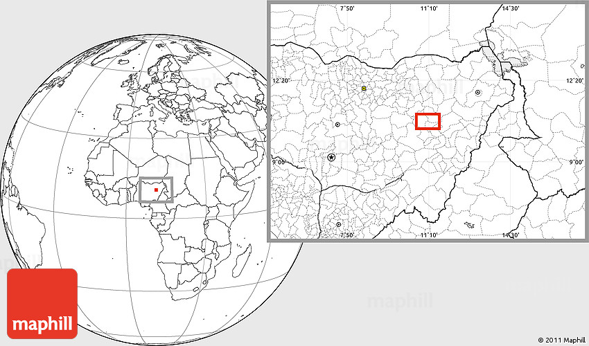 Maphill is a collection of map images. This image combines a blank map with the globe centered on the area around 10° 38' 32" N, 11° 7' 30" E. Use the buttons under the image to switch to different map types.