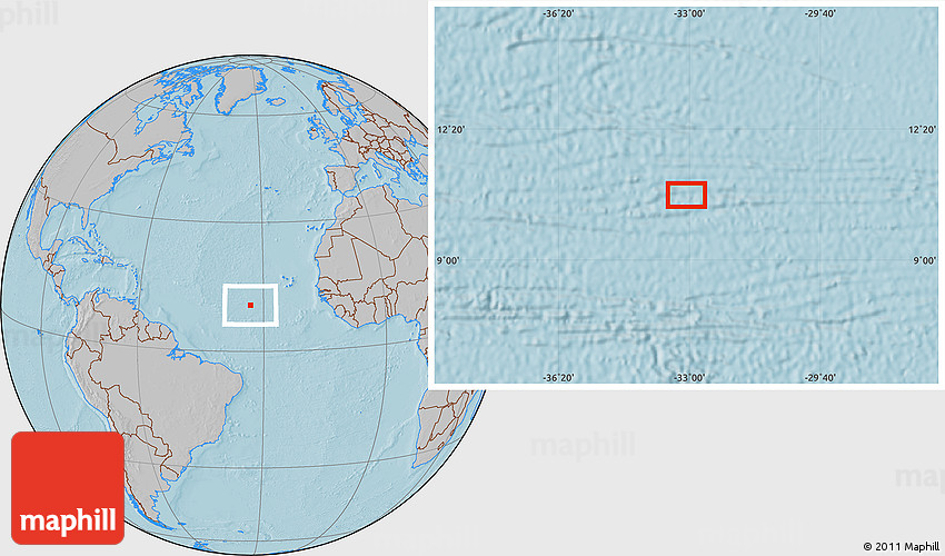 Maphill is a collection of map images. This image combines a gray map with the globe centered on the area around 10° 38' 32" N, 33° 4' 30" W. Use the buttons under the image to switch to different map types.