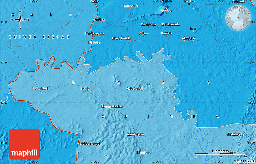 The value of Maphill lies in the possibility to look at the same area from several perspectives. Maphill presents the map of the area around 12° 11' 54" N, 13° 31' 30" W in a wide variety of map types and styles.
