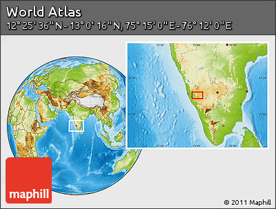 Not just this world atlas map, but all maps at Maphill are available in a common JPEG image format. You can print, copy or save the map of the area around Physical Location Map of the Area around 12° 42' 56" N, 75° 43' 29" E to your own computer very easily. Just like any other image. We are currently not able to offer PDF maps or the original vector map file editable in Adobe Illustrator or other vector graphics editors.
