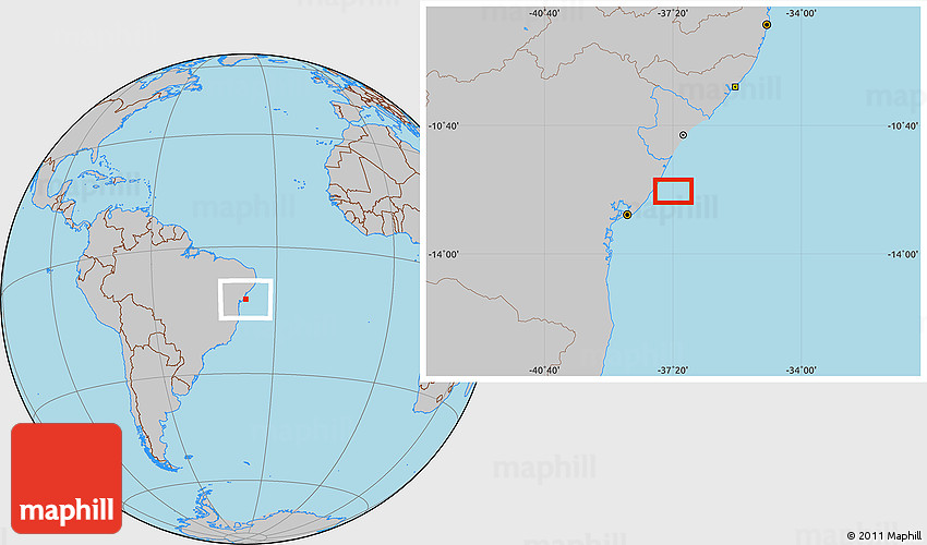 Maphill is a collection of map images. This image combines a gray map with the globe centered on the area around 12° 22' 13" S, 37° 19' 30" W. Use the buttons under the image to switch to different map types.
