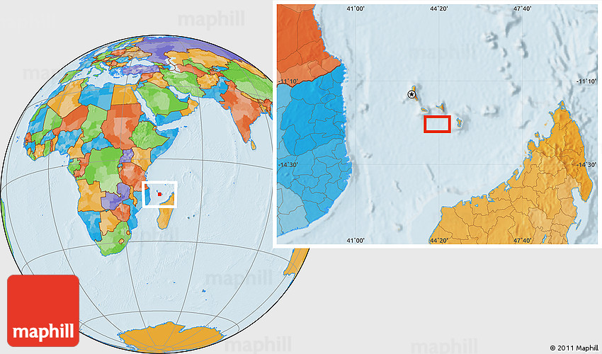 Maphill is a collection of map images. This image combines a political map with the globe centered on the area around 12° 53' 15" S, 44° 16' 29" E. Use the buttons under the image to switch to different map types.