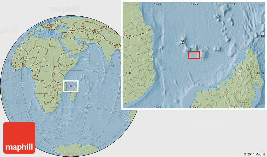 Maphill is a collection of map images. This image combines a savanna style map with the globe centered on the area around 12° 53' 15" S, 44° 16' 29" E. Use the buttons under the image to switch to different map types.