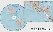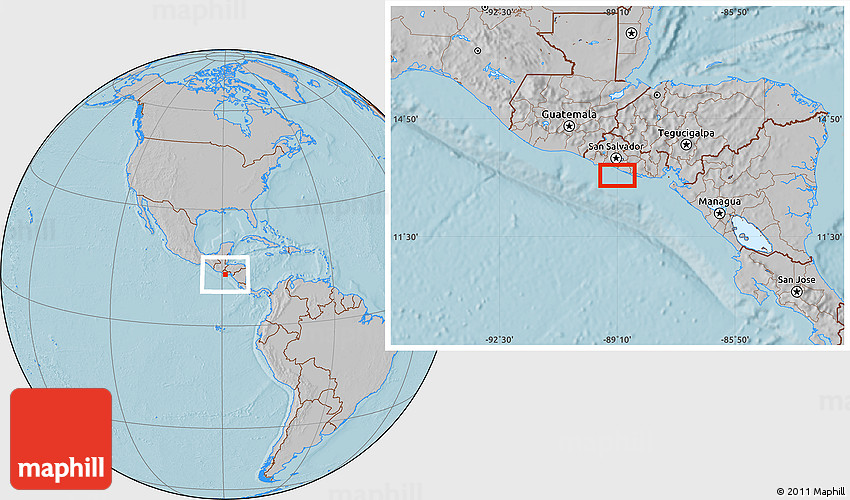 Maphill is a collection of map images. This image combines a gray map with the globe centered on the area around 13° 13' 56" N, 89° 10' 30" W. Use the buttons under the image to switch to different map types.
