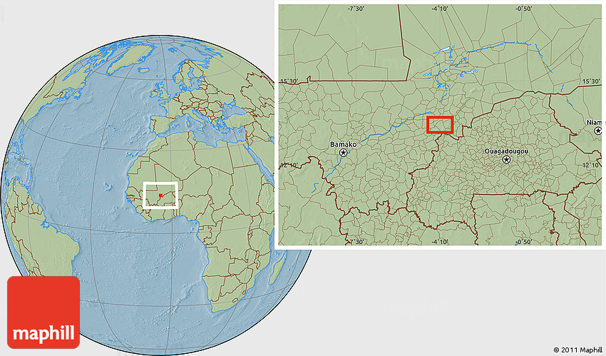 Maphill is a collection of map images. This image combines a savanna style map with the globe centered on the area around 13° 44' 54" N, 4° 10' 30" W. Use the buttons under the image to switch to different map types.