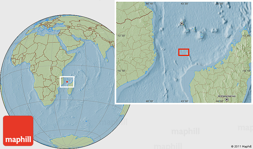 Maphill is a collection of map images. This image combines a savanna style map with the globe centered on the area around 14° 26' 6" S, 43° 25' 29" E. Use the buttons under the image to switch to different map types.