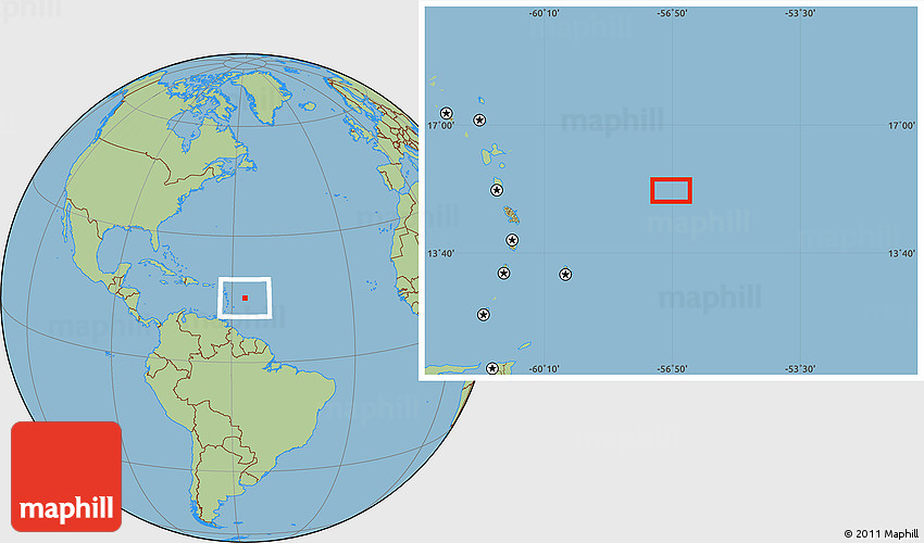 The location map of the area around 15° 17' 31" N, 56° 52' 30" W combines two projections: the orthographic azimuthal projection for the globe and the simple geographic projection for the rectangular part of the map. Geographic projection has straight meridians and parallels, each degree of latitude and longitude is the same size over the entire world map.