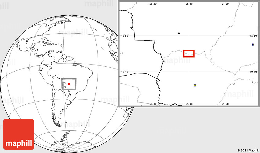 Maphill is a collection of map images. This image combines a blank map with the globe centered on the area around 17° 30' 31" S, 55° 10' 29" W. Use the buttons under the image to switch to different map types.