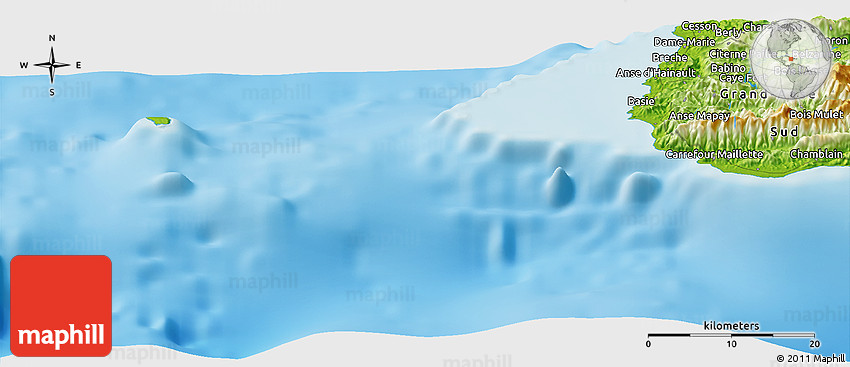 Embed the above physical panoramic map of the area around 18° 21' 26" N, 74° 43' 29" W into your website. Enrich your blog with quality map graphics. Make the web a more beautiful place.