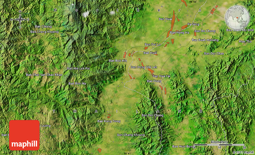 Satellite map shows the Earth's surface as it really looks like. The above map is based on satellite images taken on July 2004. This satellite map of the area around 18° 21' 26" N, 98° 40' 30" E is meant for illustration purposes only. For more detailed maps based on newer satellite and aerial images switch to a detailed map view.