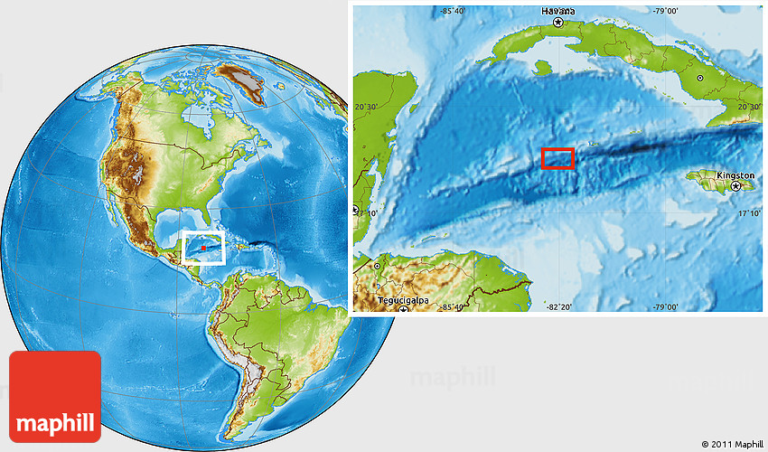Maphill is a collection of map images. This image combines a physical map with the globe centered on the area around 18° 51' 53" N, 82° 22' 30" W. Use the buttons under the image to switch to different map types.