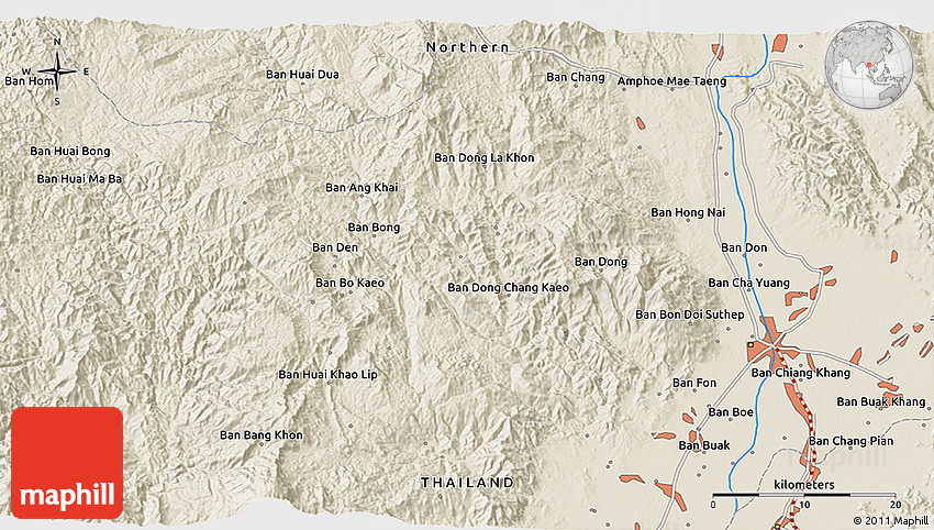 Maphill is a collection of map images. This view of the area around 18° 51' 53" N, 98° 40' 30" E at an angle of 60° is one of these images. Click on the Detailed button under the map for a more comprehensive map.