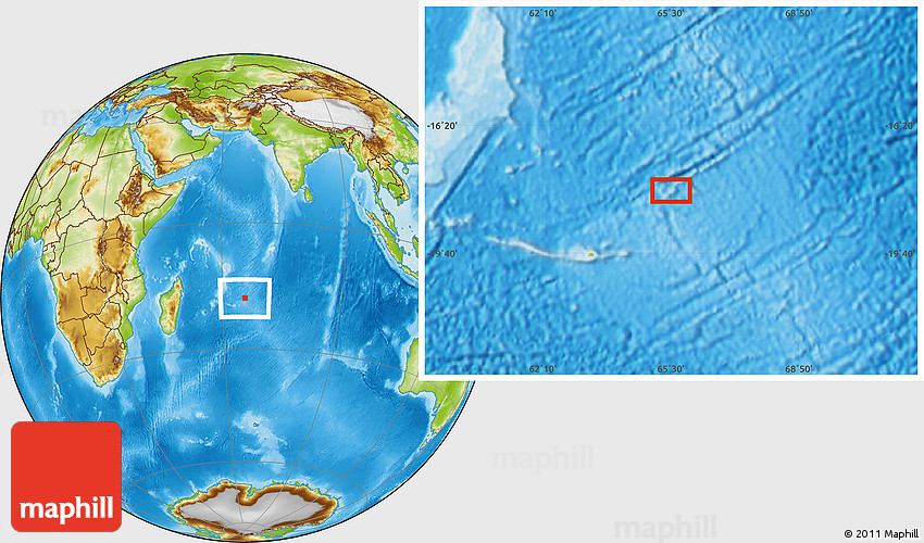 Maphill is a collection of map images. This image combines a physical map with the globe centered on the area around 18° 1' 4" S, 65° 31' 30" E. Use the buttons under the image to switch to different map types.