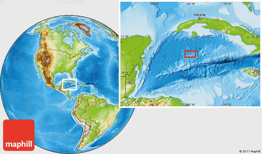 Maphill is a collection of map images. This image combines a physical map with the globe centered on the area around 19° 52' 38" N, 83° 13' 29" W. Use the buttons under the image to switch to different map types.