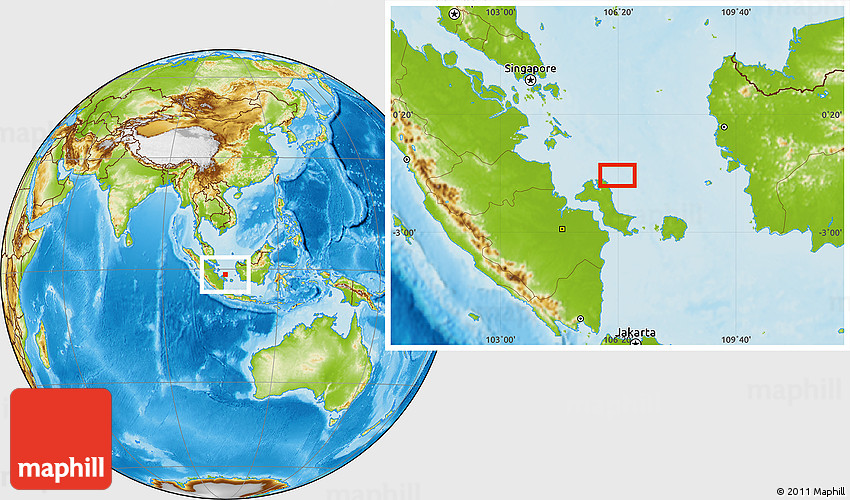 Maphill is a collection of map images. This image combines a physical map with the globe centered on the area around 1° 24' 2" S, 106° 19' 29" E. Use the buttons under the image to switch to different map types.