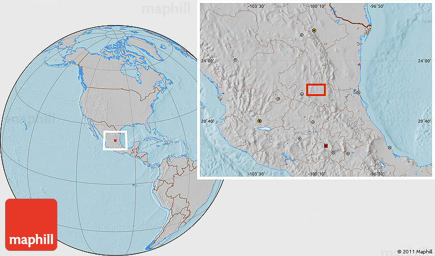 Maphill is a collection of map images. This image combines a gray map with the globe centered on the area around 22° 23' 25" N, 100° 13' 29" W. Use the buttons under the image to switch to different map types.