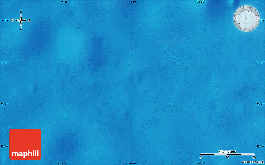 Physical map illustrates the mountains, lowlands, oceans, lakes and rivers and other physical landscape features of the area around 23° 53' 5" N, 174° 10' 30" W. Differences in land elevations relative to the sea level are represented by color.