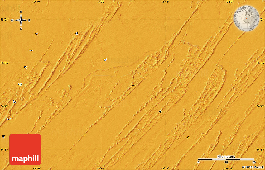 The value of Maphill lies in the possibility to look at the same area from several perspectives. Maphill presents the map of the area around 24° 52' 30" N, 3° 19' 30" W in a wide variety of map types and styles.