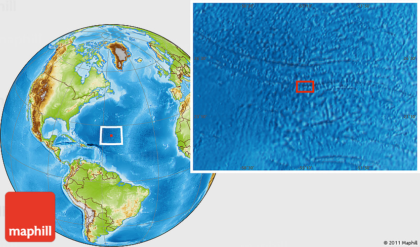 Maphill is a collection of map images. This image combines a physical map with the globe centered on the area around 24° 52' 30" N, 55° 10' 29" W. Use the buttons under the image to switch to different map types.