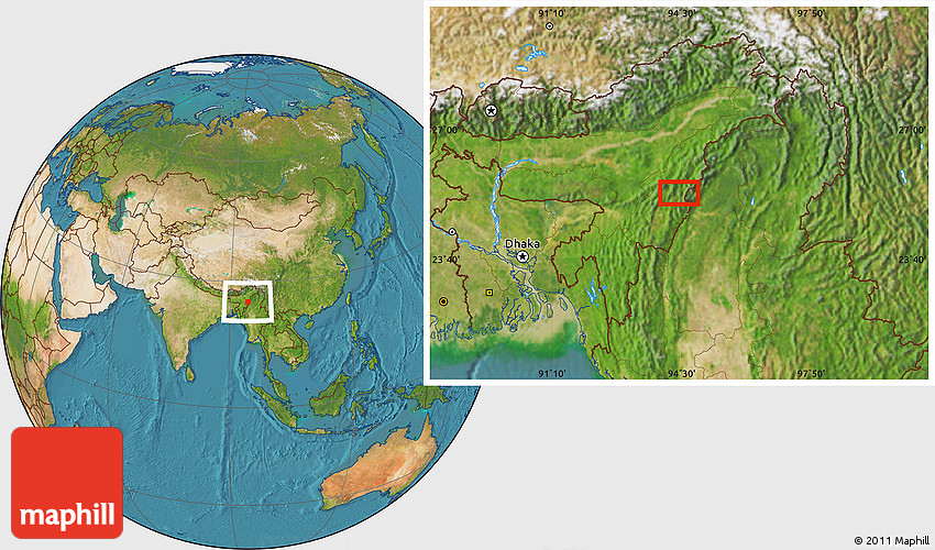 Maphill is a collection of map images. This image combines a satellite map with the globe centered on the area around 25° 22' 6" N, 94° 25' 30" E. Use the buttons under the image to switch to different map types.