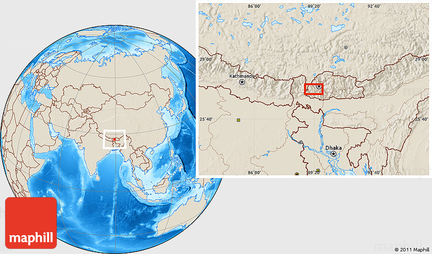 Maphill is a collection of map images. This image combines a shaded relief map with the globe centered on the area around 27° 19' 44" N, 89° 19' 29" E. Use the buttons under the image to switch to different map types.