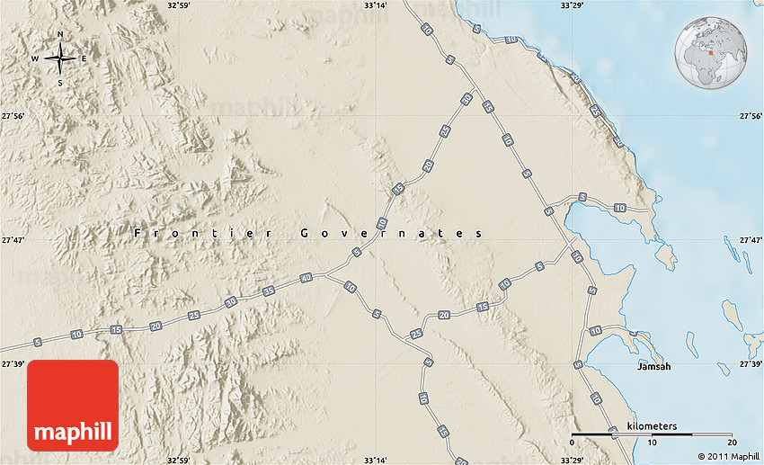 Maphill is a collection of map images. This shaded relief map of the area around 27° 48' 57" N, 33° 13' 30" E is one of them. Click on the Detailed button under the image to switch to a more detailed map.