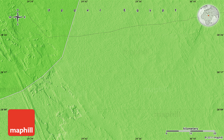 The flat political map represents one of several map types and styles available. Look at the area around 28° 18' 5" N, 29° 49' 30" E from different perspectives.