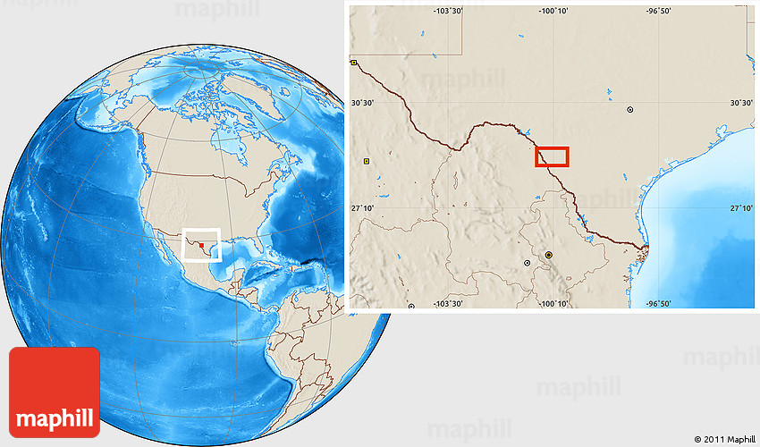 Maphill is a collection of map images. This image combines a shaded relief map with the globe centered on the area around 28° 47' 8" N, 100° 13' 29" W. Use the buttons under the image to switch to different map types.