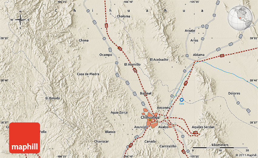 Maphill is a collection of map images. This shaded relief map of the area around 28° 47' 8" N, 106° 10' 30" W is one of them. Click on the Detailed button under the image to switch to a more detailed map.